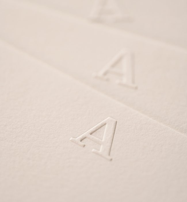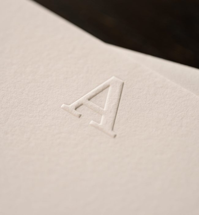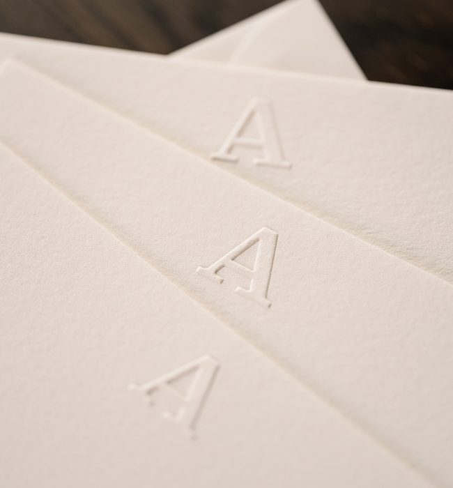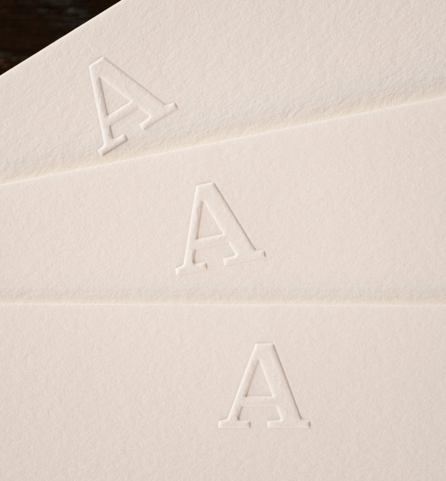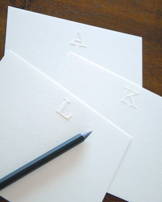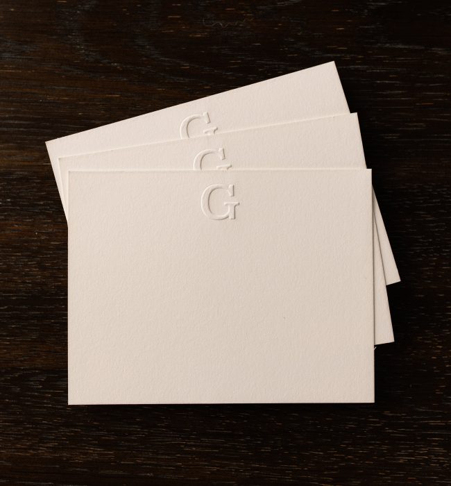 Perfect for gift giving, this custom stationery set includes a letter, blind embossed, across the top of the flat notecard, with space below for a message.