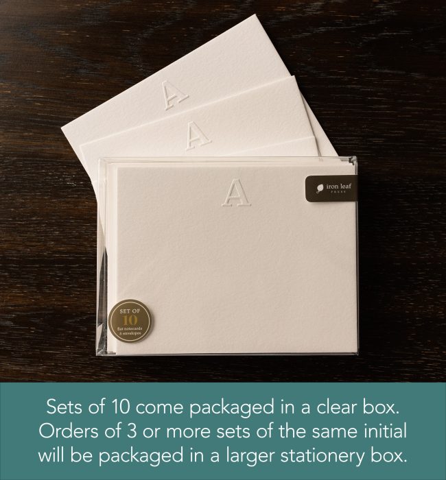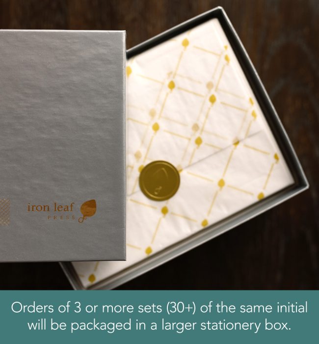 Ready to order? Choose the letter you’d like on the stationery from the drop-down menu. Custom stationery will be produced within 3-6 days if not in stock*. Orders ship in a clear plastic stationery box suitable for gift-giving. Orders of 3 or more sets of 10 of the same initial will be packaged in a larger silver stationery box.