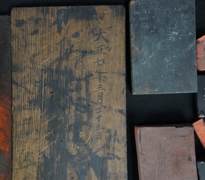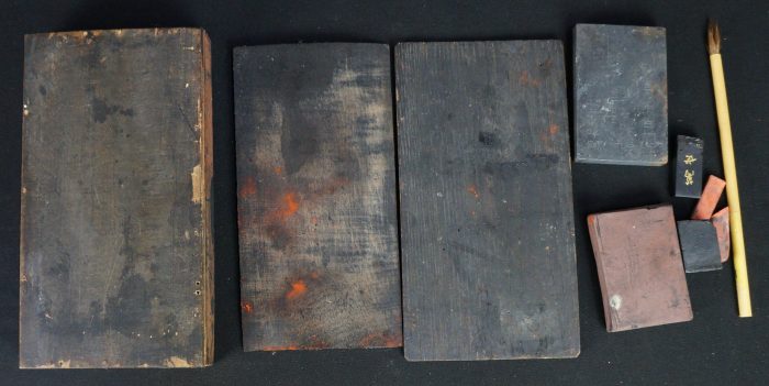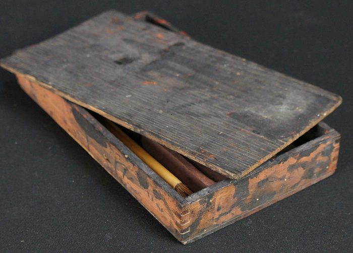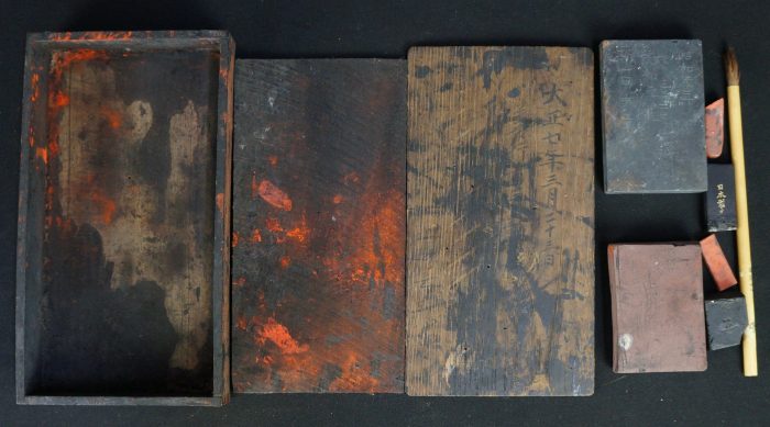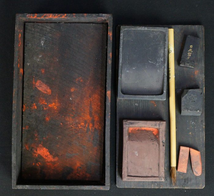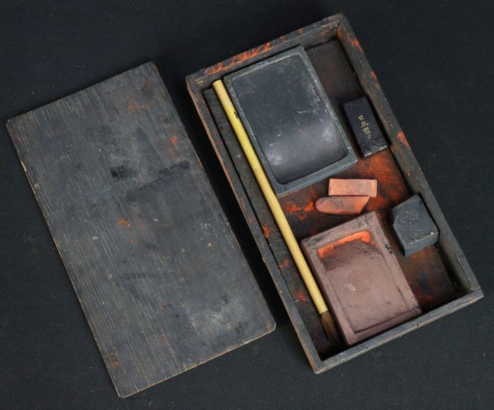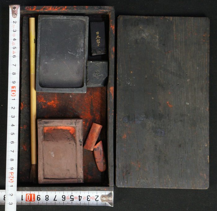 Vintage Japanese school portable writing set Suzuri-bako calligraphy tool, complete of box, 2 Suzuri ink basin, 4 ink bar, 1 Fude brushe. Very worn from extensive usage, niche character, box in delicate conditions. Still usable.