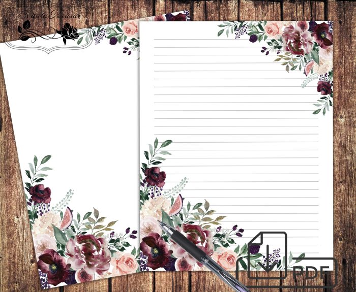 Letter printable writing paper, Floral decor stationery set, unlined lined paper