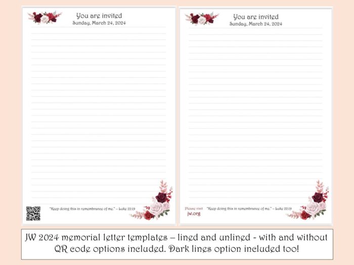 Memorial 2024 JW Letter Writing Templates for Jehovah’s Witnesses with and without QR code lined and unlined Ministry Digital Download Paper$1.27