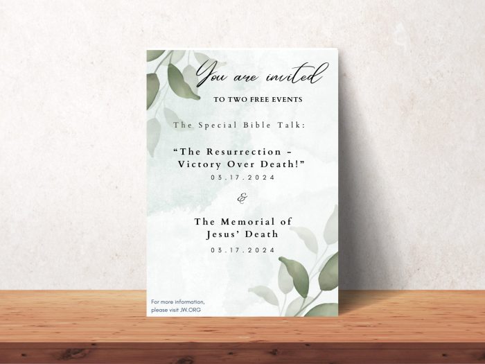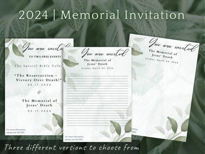 Three 2024 Memorial Invitation Letterhead designs. This bundle is a Green Leafe design. These are just right for sending to loved ones/family and also for use in the ministry. Perfect for letter writing! These are tools that can be used in inviting interested ones to commemorate the death of Jesus. I also included a version where there’s also an invite to the special talk!