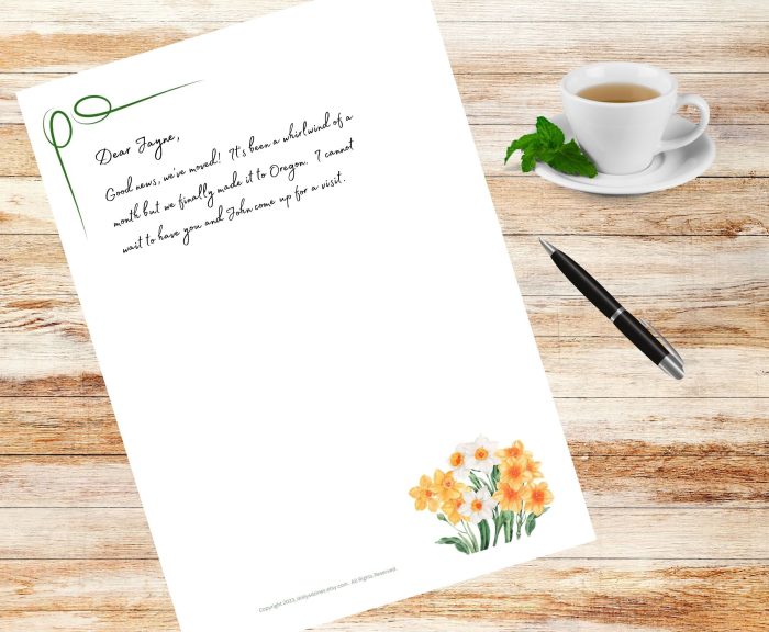 Narcissus buds peeking through the ground are a sign that Spring is on its way. Just thinking about them you can almost smell the pungent, yet sweet fragrance. It is perfect for sending a letter to friends, family, coworkers and others that you just want to say “hi” to or catch up on old times. Set includes a single design with one sheet each lined and unlined. The lined paper row height is roughly equivalent to wide-ruled lined notebook paper, or 24 point font size. Each writing paper is 8.5”W x 11”H and can be printed as many times as you like. We recommend a high quality paper using the highest image quality possible. There is also a matching theme printable envelope.