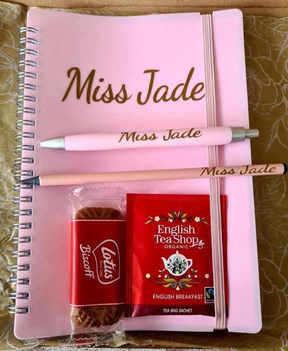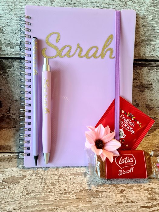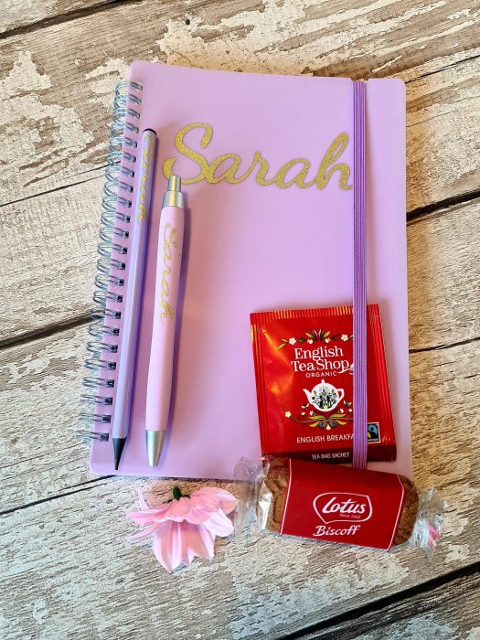 SELF GIFT – PERSONALISED notebook, pen, pencil, tea/coffee and biscuits – enjoy yourself or gift a friend
