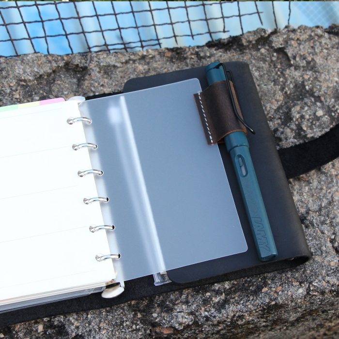 This is a pen holder specially made for 6-ring binder notebook. No more searching for a pen when inspiration strikes! Your pen remains attached to your notebook, ready whenever you need it!