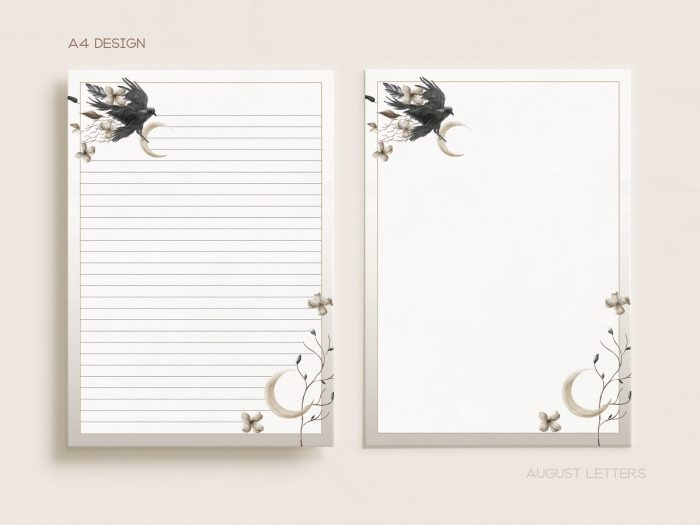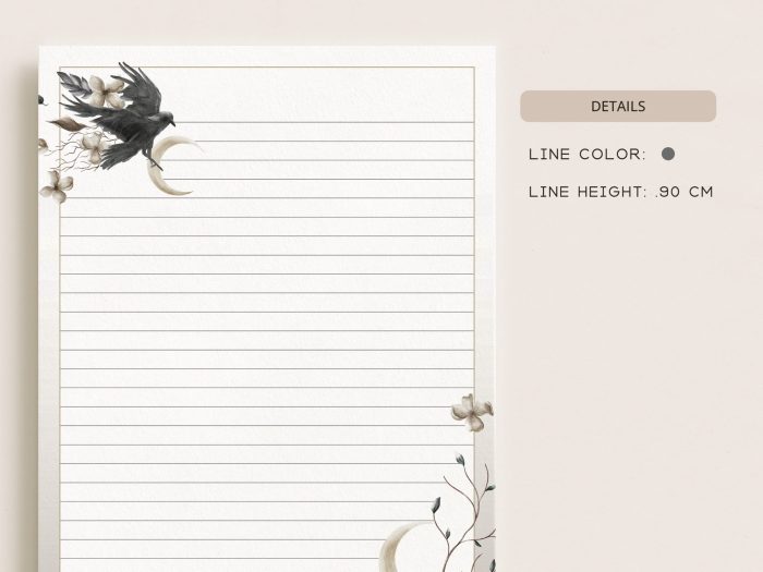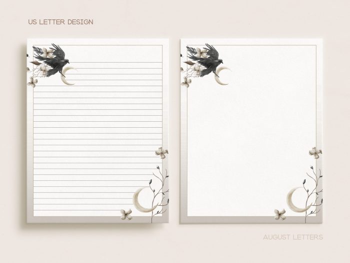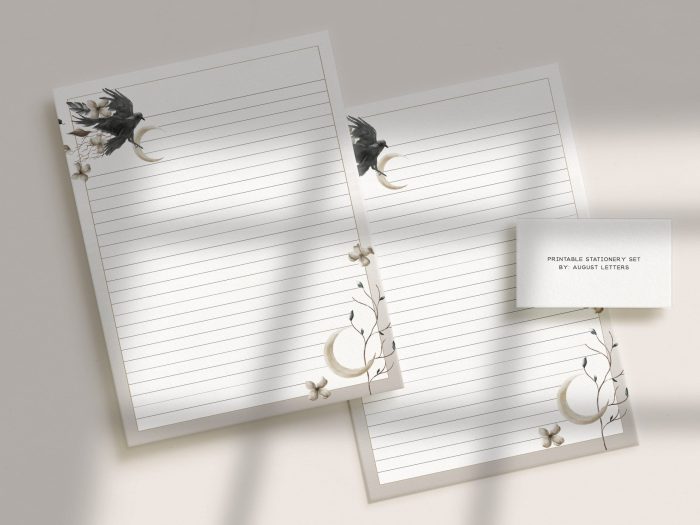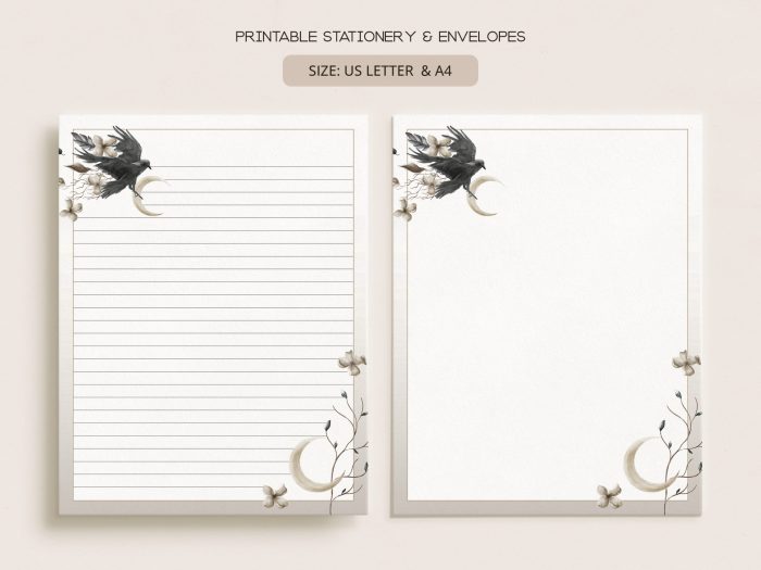 Printable Stationery Set With Envelopes | Lined Unlined Digital Letter Writing Paper | A4, US Letter 8.5×11 | Black Crow Bird Moon CE11$2.70
