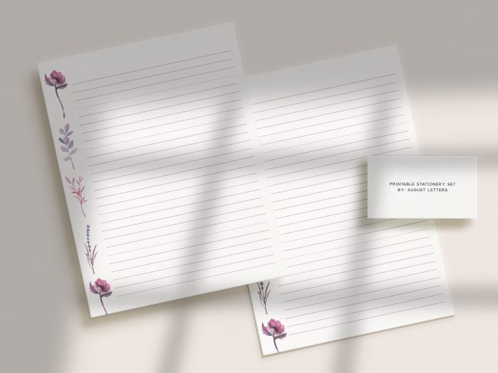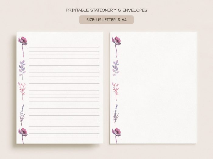 Printable Stationery Set With Envelopes | Lined Unlined Digital Letter Writing Paper | A4, US Letter 8.5×11 | Pink Purple Florals | FL17$2.70