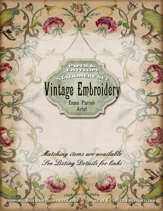A matching printable paper set, featuring 20 Vintage embroidery designs is available here