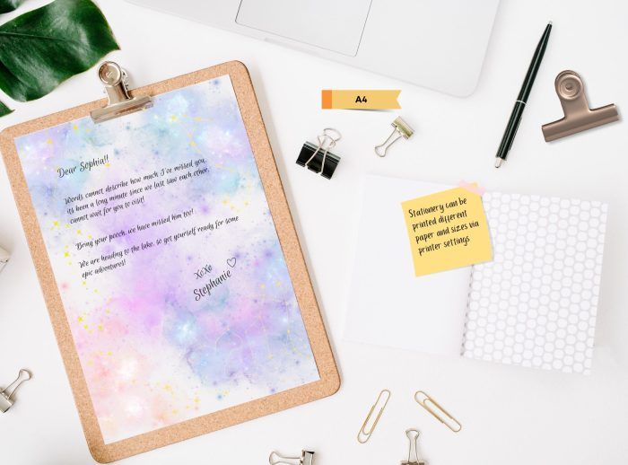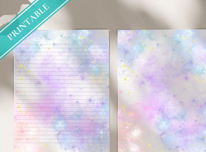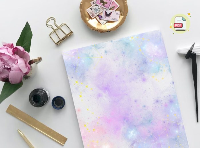 Purple Sky Galaxy – Express yourself with a touch of fantasy using our Purple Galaxy Stationery. Created with delicate watercolor strokes, this paper presents a dreamy fusion of sky-blue and purple, reminiscent of fantastical clouds at dusk. Striking a balance between whimsy and elegance, it provides a serene backdrop for your thoughts, notes, and messages. Lines are set in purple.