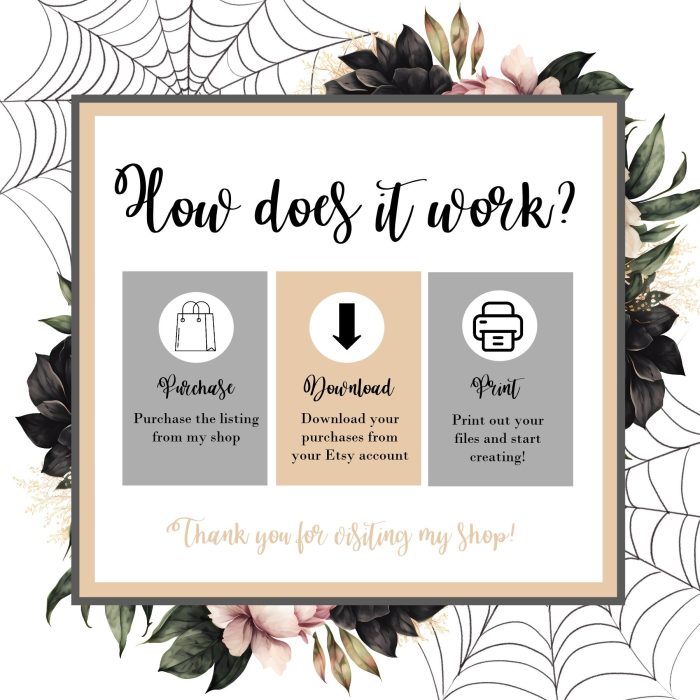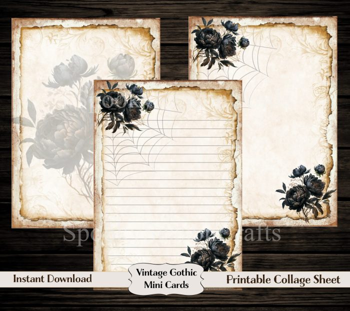 Thank you for visiting my etsy shop! This is my new set of 4 vintage style writing papers with black peonies and spider webs. These papers are perfect for letter writing, junk journaling, printable stationery and gothic halloween projects.