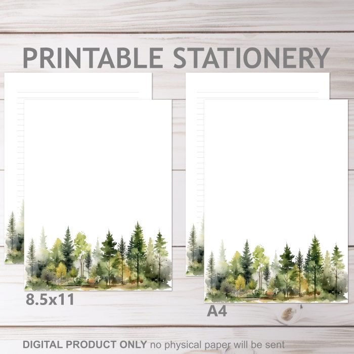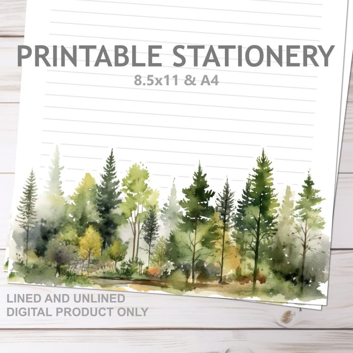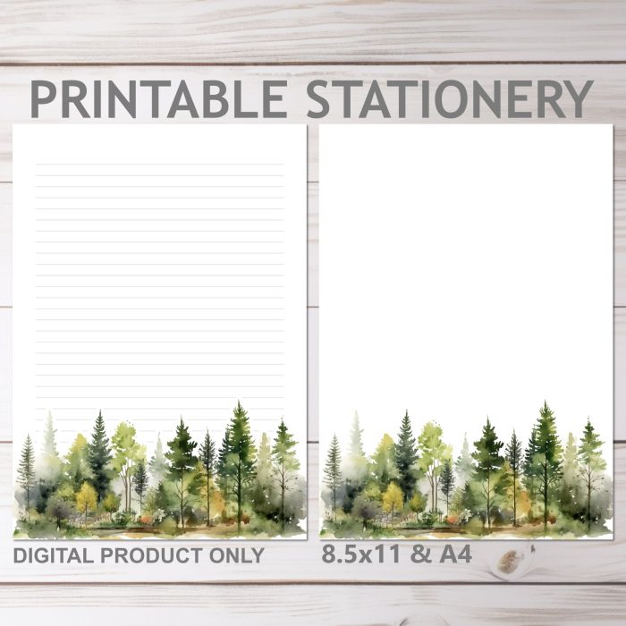 Watercolor Forest Trees Printable Stationery Lined and Unlined in A4 and 8.5×11 Letter | Print at Home Stationery Set Writing Paper$2.48
